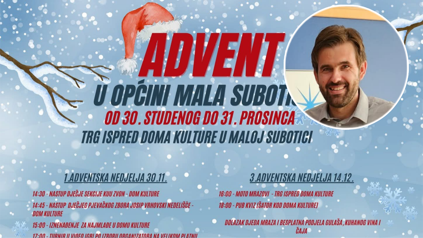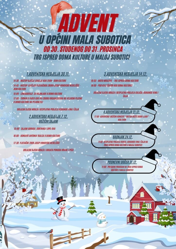 Općina Mala Subotica poziva sve mještane i posjetitelje na manifestaciju Advent u Općini Mala Subotica, koja će se održavati od 30. studenog do 31. prosinca ispred i unutar Doma kulture u Maloj Subotici. U nastavku je raspored događanja.