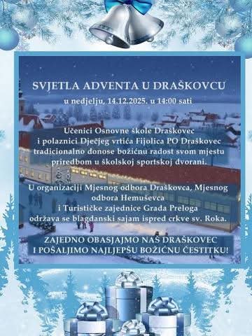 Adventskim događanjima na području Grada Preloga ove se godine pridružuje i Draškovec, koji će uoči Božića zasjati u blagdanskom ozračju. Mještane i posjetitelje očekuje bogat program ispunjen glazbom, dječjom radošću i druženjem.