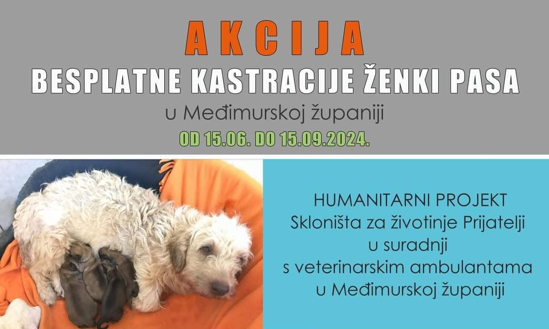 Ponukani sve većim brojem napuštenih životinja i prepunim skloništem koje se puni „viškovima“ štenaca odbačenih posvuda, a najviše po romskim naseljima, Sklonište za životinje Prijatelji iz Čakovca u suradnji sa svim veterinarskim ambulantama iz Međimurja organizira besplatne kastracije ženki pasa u trajanju od 15.lipnja do 15. rujna ove godine.