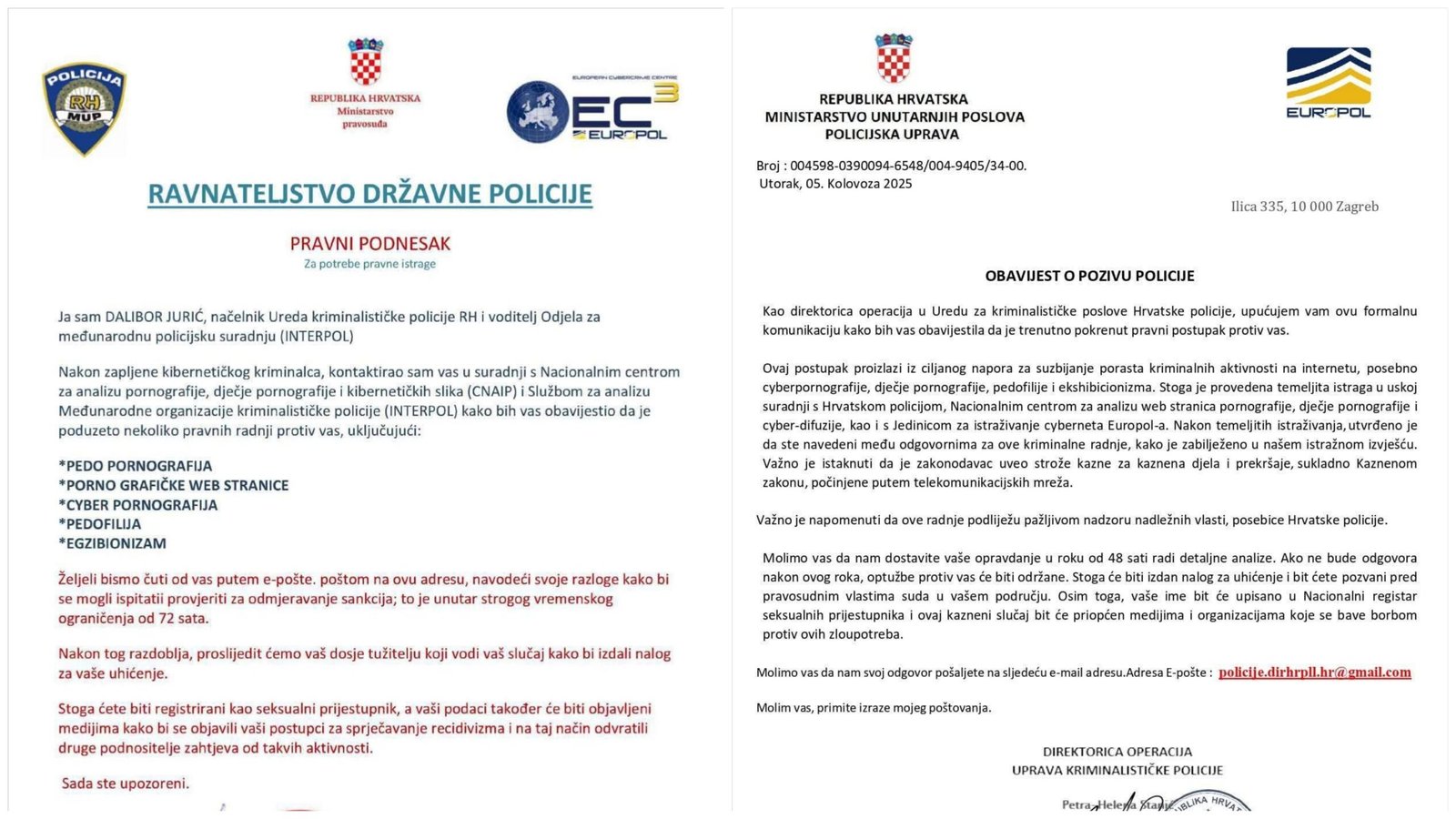 Svako malo u javnosti se pojavi neka lažna poruka u kojoj se nepoznata osoba predstavlja kao osoba, odnosno „rukovoditelj organizacijske jedinice Uprave kriminalističke policije“ te navodi kako je primatelj poruke osumnjičen za više različitih kaznenih djela od „pedopornografije, cyber pornografije, pedofilije, egzibicionizma, gledanja porno grafičke web stranice“ i traži od primatelja da odgovori na poruku, a sve s ciljem pribavljanja protupravne imovinske koristi.