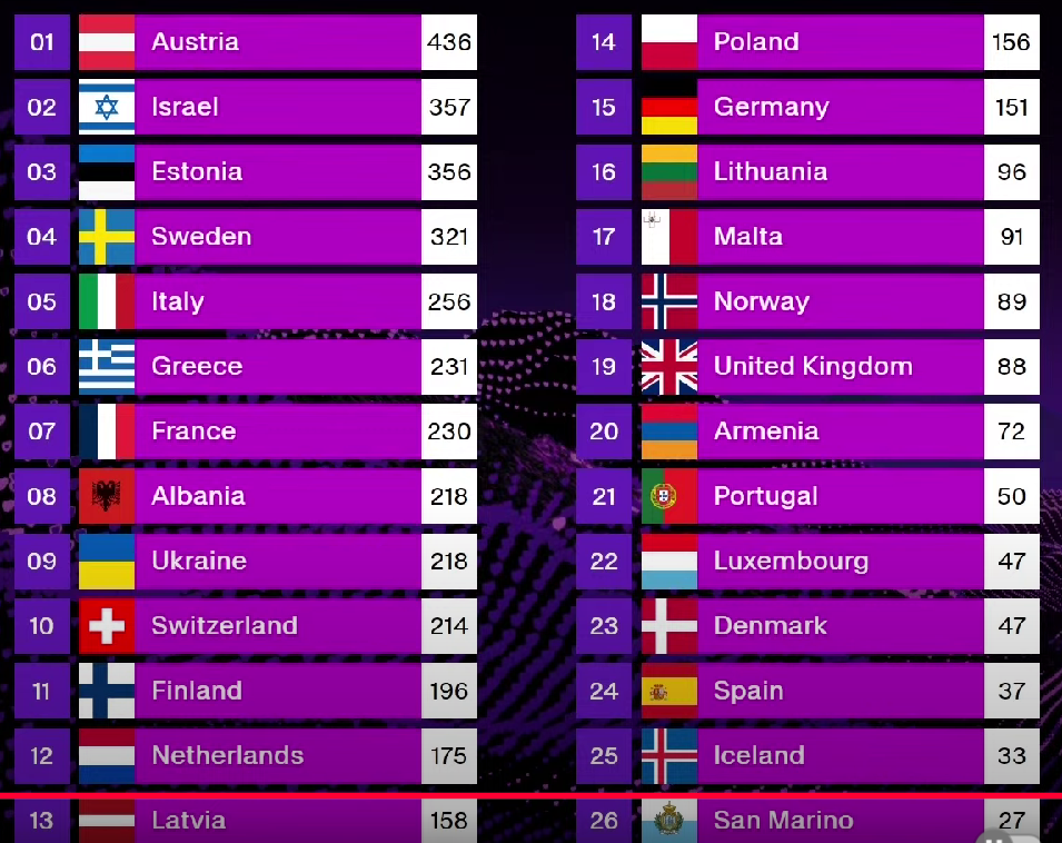 Drugo mjesto zauzeo je Izrael, dok je treće mjesto pripalo Estoniji. Švedska je završila na četvrtom mjestu, a Italija na petom. Na suprotnoj strani ljestvice, zadnji je bio San Marino, čiji nastup nije uspio osvojiti dovoljno bodova za viši plasman.