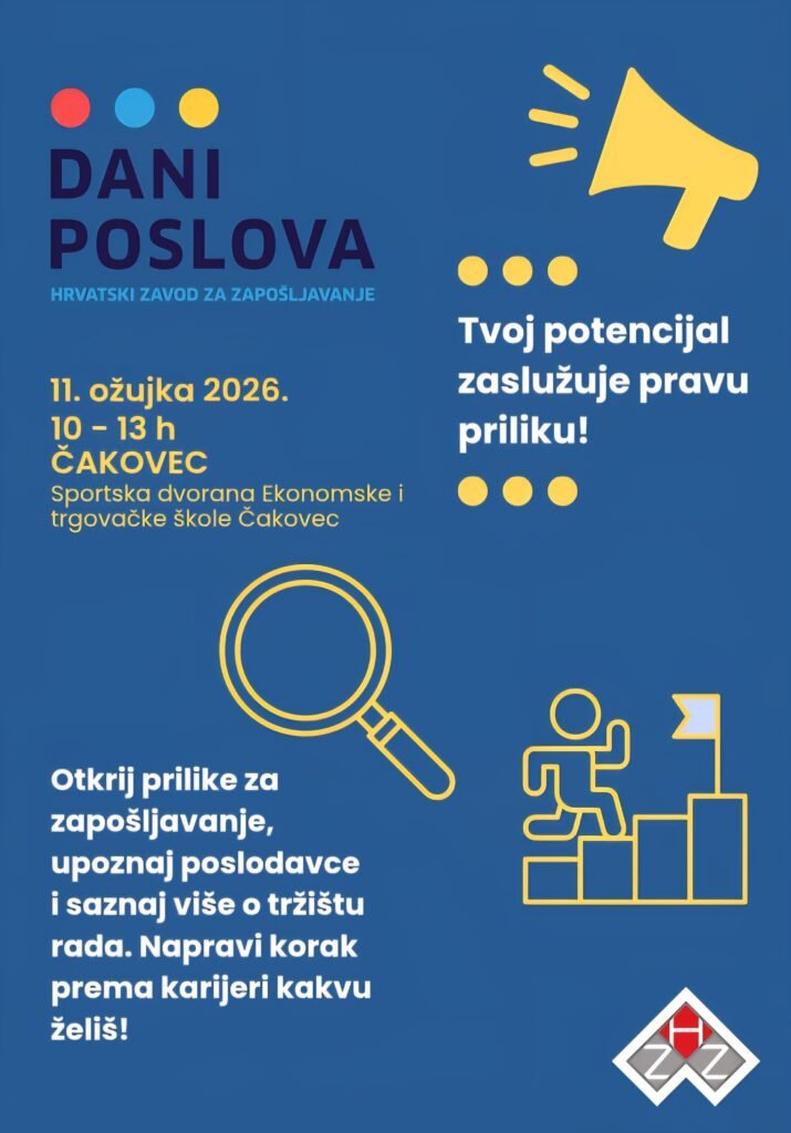 ​Tražite li svoj prvi posao, razmišljate o promjeni karijere ili vas jednostavno zanima što se trenutno nudi na tržištu rada? Označite srijedu, 11. ožujka 2026. u svojim kalendarima, jer u Čakovec stižu „Dani poslova“ u organizaciji Hrvatskog zavoda za zapošljavanje.