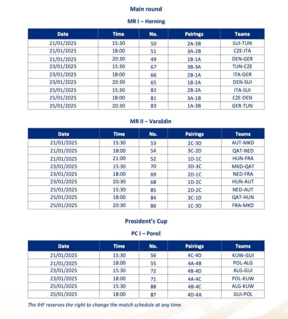 Nakon završetka prvog kruga u skupinama A, B, C i D, Međunarodna rukometna federacije (IHF) objavila je raspored i satnicu za nastavak natjecanja glavnoj fazi, odnosno za President kup u Poreču.