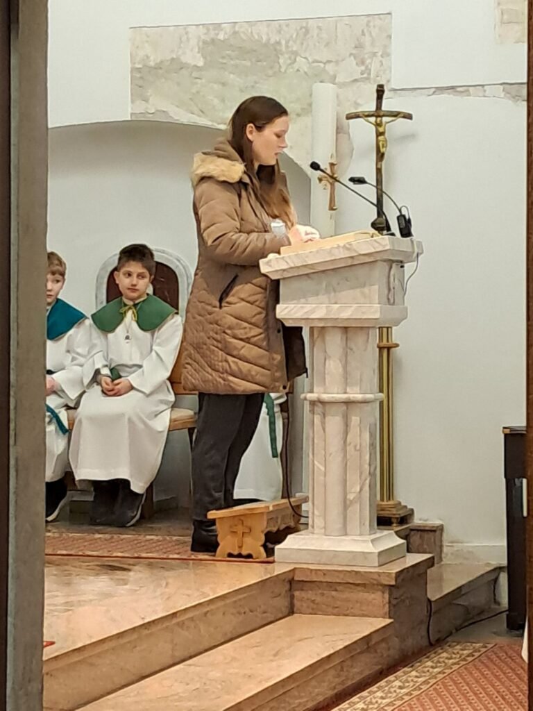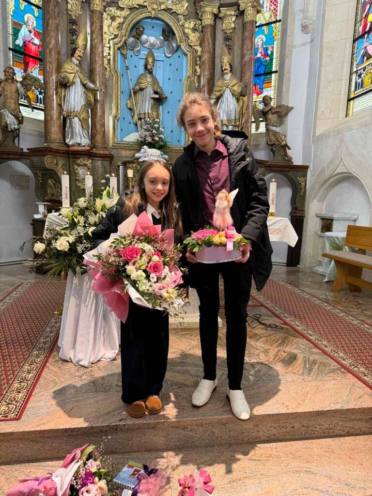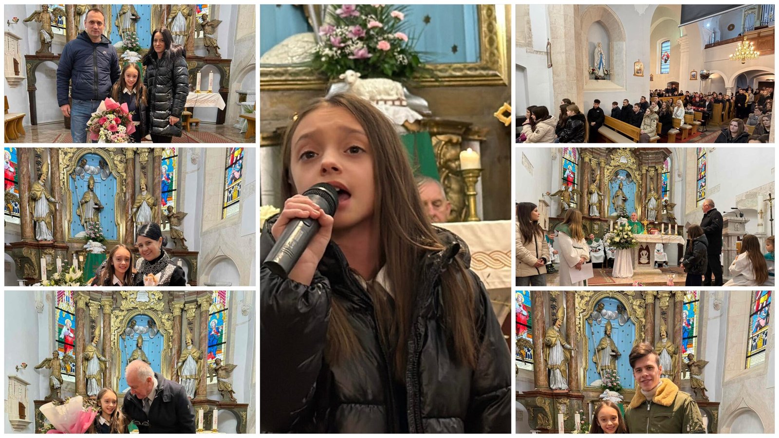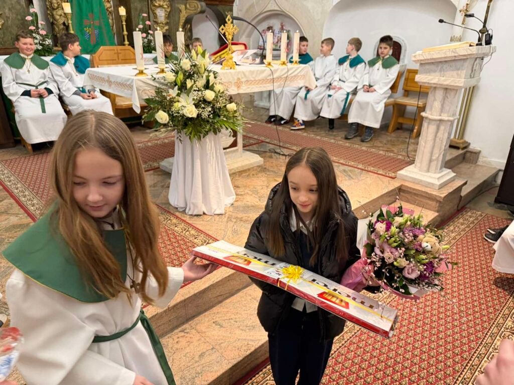 Susret je započeo pjesmom Dječjeg zbora, koji je Nikol srdačno pozdravio te joj, kao znak ljubavi i ponosa, predao prigodan dar. Radosna dječja pjesma i iskreni osmijesi ispunili su crkvu posebnom toplinom i pokazali koliko je Nikol svojom pobjedom nadahnula najmlađe članove naše zajednice.