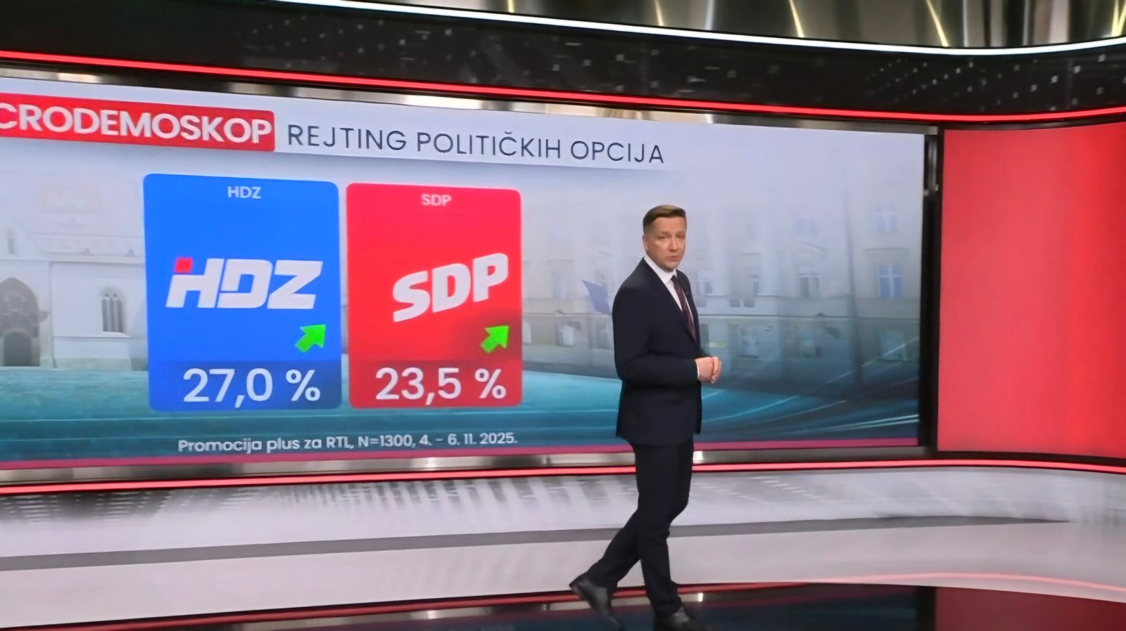 Najnovije istraživanje CRO Demoskop, koje je početkom studenoga za RTL provela agencija Promocija plus, pokazuje da Hrvatska demokratska zajednica (HDZ) i dalje uvjerljivo predvodi političku scenu. Vladajuća stranka uživa 27 posto potpore birača, što je blagi porast u odnosu na prethodni mjesec.