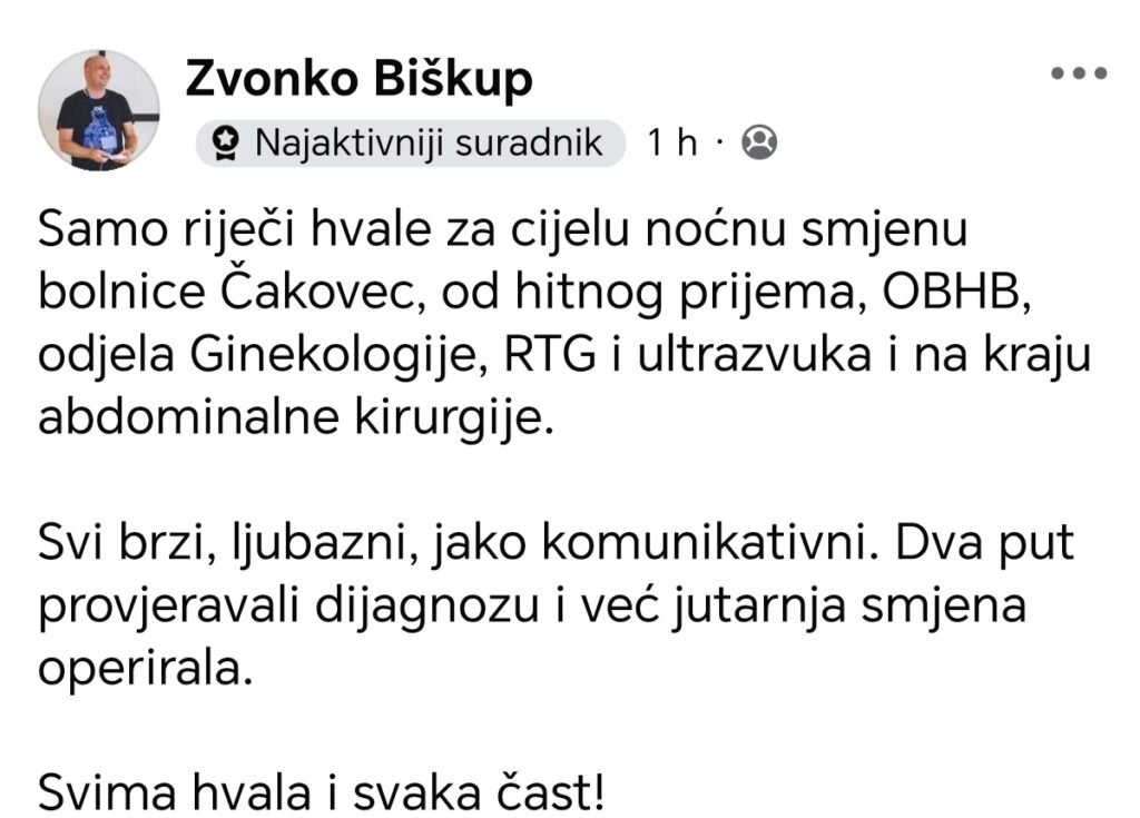 Sve češće na društvenim mrežama i među građanima Čakovca mogu se vidjeti pohvale za Bolnicu Čakovec i njezino medicinsko osoblje. Jutros je tako gospodin Zvonko Biškup u Facebook grupi Č&Č istaknuo izvanredan rad noćne smjene, od Hitnog prijema, OBHB i odjela Ginekologije, do RTG-a, ultrazvuka i Abdominalne kirurgije.