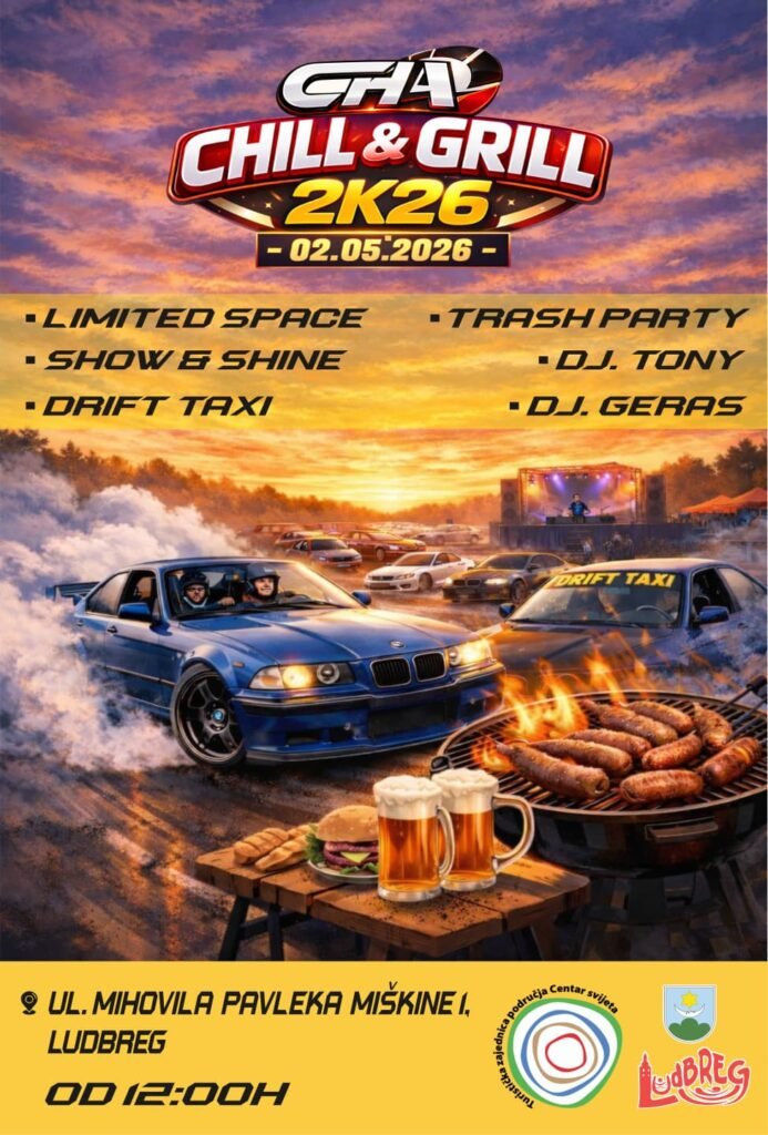 U Ludbregu nas početkom svibnja očekuje još jedan sadržajan i energičan događaj koji spaja ljubitelje automobila, dobre hrane i glazbe – CHA Chill & Grill 2K26, koji će se održati u subotu, 2. svibnja, od 12 sati u Ulici Mihovila Pavleka Miškine.