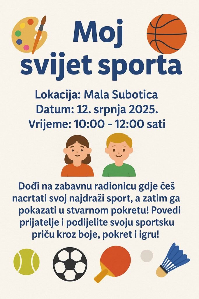 U subotu, 12. srpnja 2025., u Maloj Subotici, Dom kulture održat će se kreativna radionica za djecu pod nazivom „Moj svijet sporta“. Ovo će biti sportska radionica. Djeca sudionici budu mogla crtati svoj najdraži sport a mogu od kuće donijeti i loptu pa se mogu igrati sportske igre.