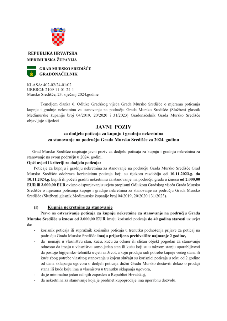 MURSKO SREDIŠĆE Javni poziv za dodjelu poticaja za kupnju i gradnju nekretnina za stanovanje