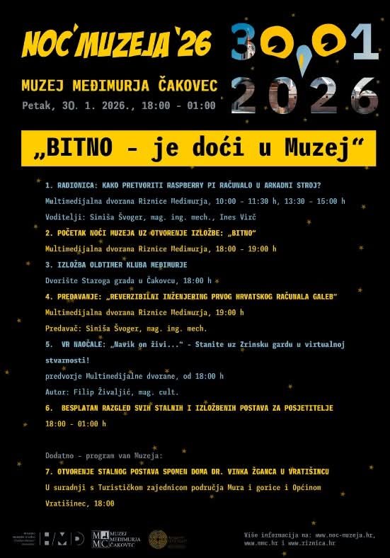 Muzej Međimurja Čakovec i ove se godine uključuje u nacionalnu manifestaciju Noć muzeja, a posjetiteljima će u petak, 30. siječnja 2026. godine, ponuditi bogat i raznolik program koji spaja povijest, tehnologiju i suvremene inovacije. Vrata muzeja bit će otvorena od 18 do 1 sat iza ponoći, a ulaz na sve programe je besplatan.
