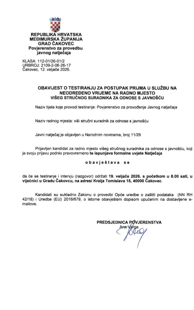 Na službenim stranicama Grada Čakovca objavljena je obavijest o testiranju kandidata za radno mjesto višeg stručnog suradnika za odnose s javnošću, i to na neodređeno vrijeme. Drugim riječima, Grad ponovno zapošljava, i to za stalno.