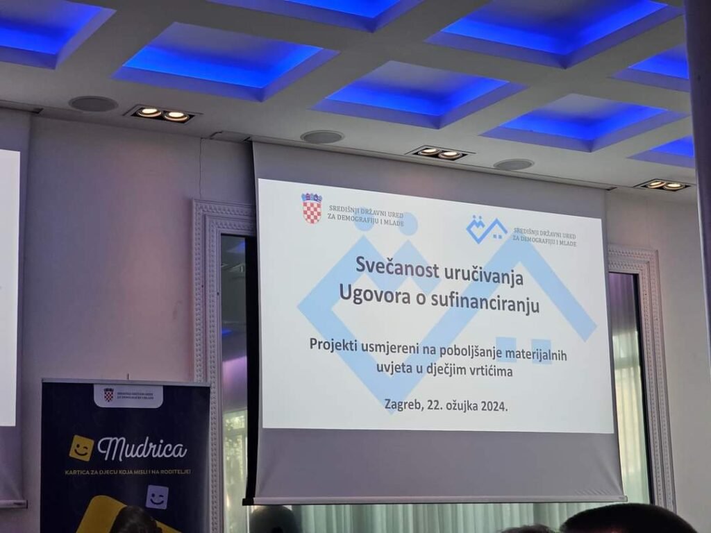 Općinska načelnica Bojana Petrić danas je prisustvovala svečanoj dodjeli Ugovora o sufinanciranju projekata usmjerenih na poboljšanje materijalnih uvjeta u dječjim vrtićima Središnjeg državnog ureda za demografiju i mlade.