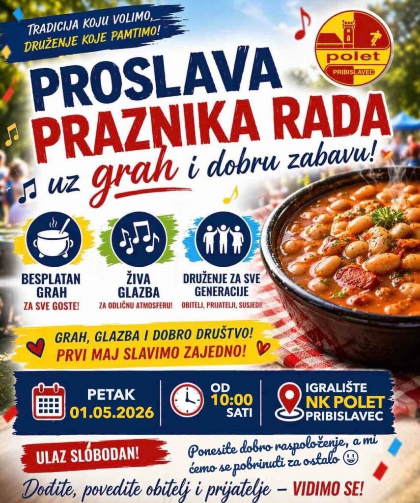 ​Proslava započinje u 10:00 sati na poznatoj lokaciji – igralištu NK Polet Pribislavec. Kako i priliči ovom blagdanu, središnji dio ponude bit će besplatan grah za sve goste, simbol radničkog praznika i nezaobilazan dio prvosvibanjskih druženja.