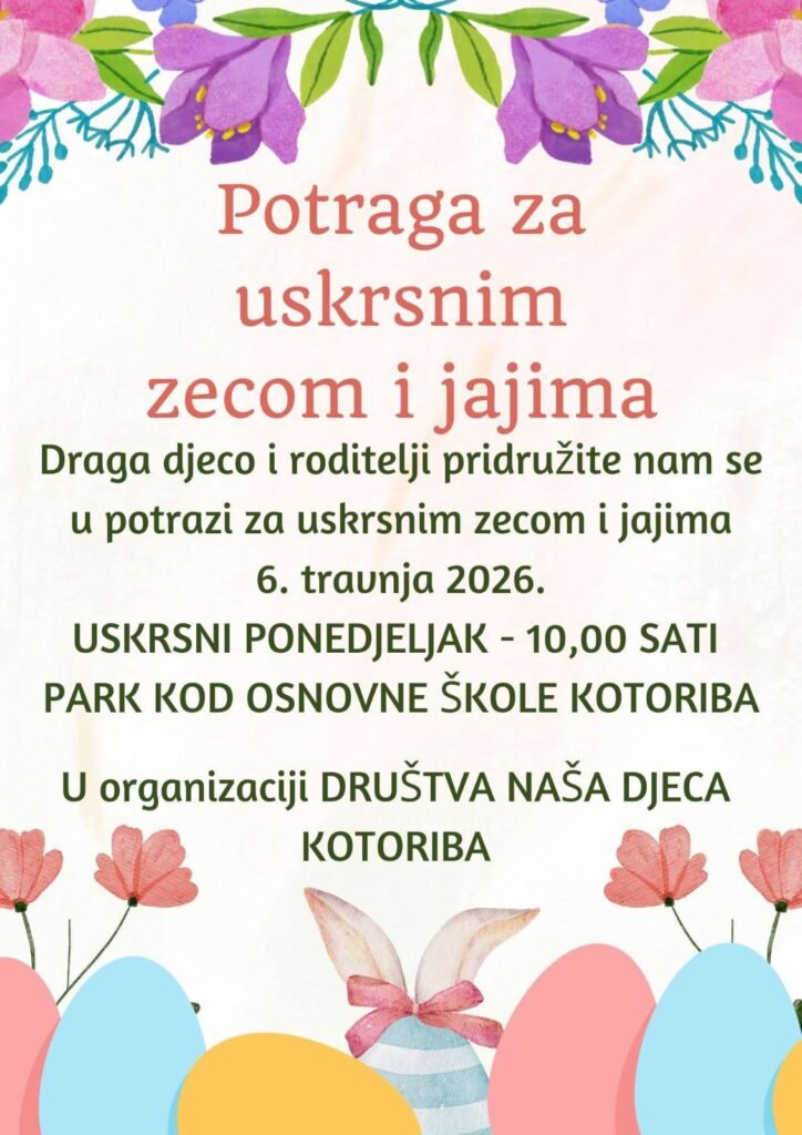 Općina Kotoriba poziva sve mališane da se pridruže tradicionalnoj uskrsnoj zabavi – potrazi za uskrsnim zecom. Događaj, koji organizira Društvo „Naša djeca“ Kotoriba, održat će se u Uskrsni ponedjeljak, 6. travnja 2026. u 10 sati, u parku kod Osnovne škole Kotoriba.
